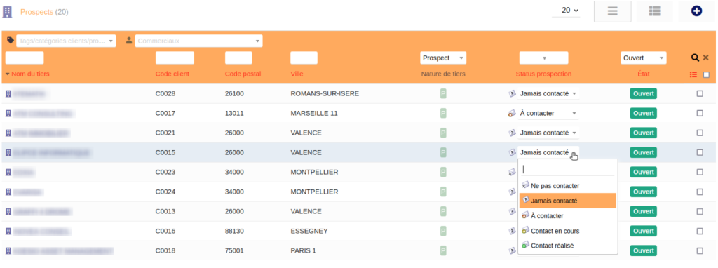 • Ajout de la possibilité de modifier le statut de prospection d’un tiers directement depuis la liste.